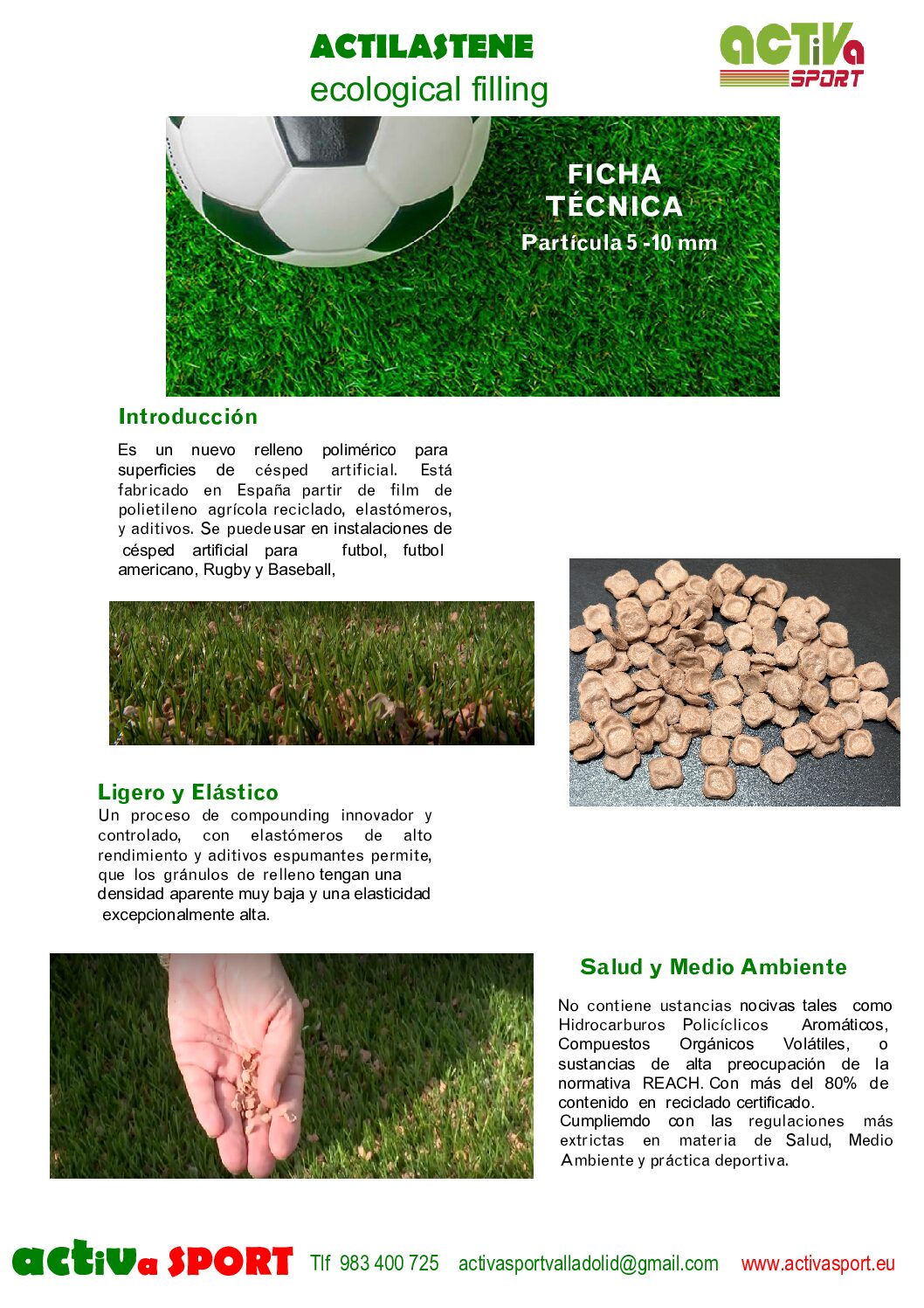 Nuevo relleno para campos deportivos para sustituir los granos de caucho reciclado prohibido por la UE. Está fabricado en España partir de film de polietileno agrícola reciclado, elastómeros, y aditivos. Se puede usar en instalaciones de césped artificial para futbol, futbol americano, Rugby y Baseball. Un proceso de compounding innovador y controlado, con elastómeros de alto rendimiento y aditivos espumantes permite, que los gránulos de relleno tengan una densidad aparente muy baja y una elasticidad muy alta. No contiene sustancias nocivas tales como Hidrocarburos Policíclicos Aromáticos, Compuestos Orgánicos Volátiles, o sustancias de alta preocupación de la normativa REACH. Con más del 80% de contenido en reciclado certificado.